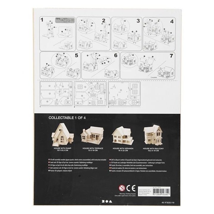 Il set 3D della casa in legno porta divertimento per tutta la famiglia. Crea la tua mini casa, che potrai poi rifinire e decorare secondo le tue idee. Questa casa non è solo una decorazione interessante, ma può essere utilizzata anche dai bambini per giocare. Il compensato leggero è un materiale adatto per ulteriori lavorazioni, quindi puoi dipingere la casa, incollare decorazioni su di essa, ma anche usare tecniche di decoupage e simili. Le istruzioni dettagliate per il montaggio della casa si trovano sulla confezione del prodotto.