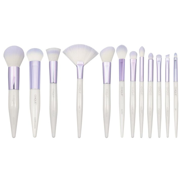 Porta il tuo look alla perfezione con questo set bianco-viola di pennelli cosmetici CHIQUE per il viso del famoso marchio americano Royal & Langnickel. In ogni set troverai vari pennelli per cipria, ombretti, sopracciglia, labbra. Basta scegliere i pennelli giusti per te. Le fibre sintetiche di qualità professionale sono vegane e non sono state testate sugli animali. Eleganti manici in alluminio rosa-oro offrono la massima durata e sono impermeabili.